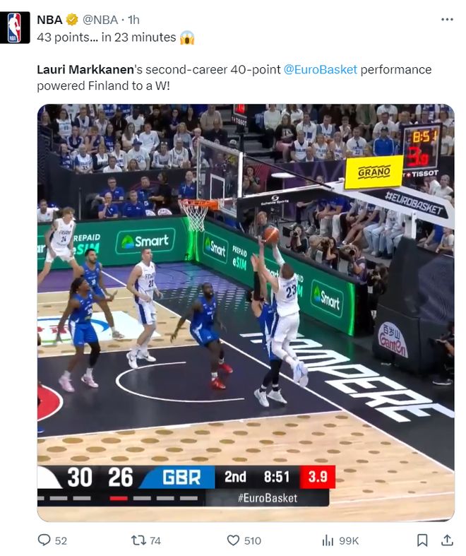 美媒NBA Mems:在欧洲杯上,马尔卡宁在23分钟内得到43分,犹他爵士这几年真是浪费了他的才能。
