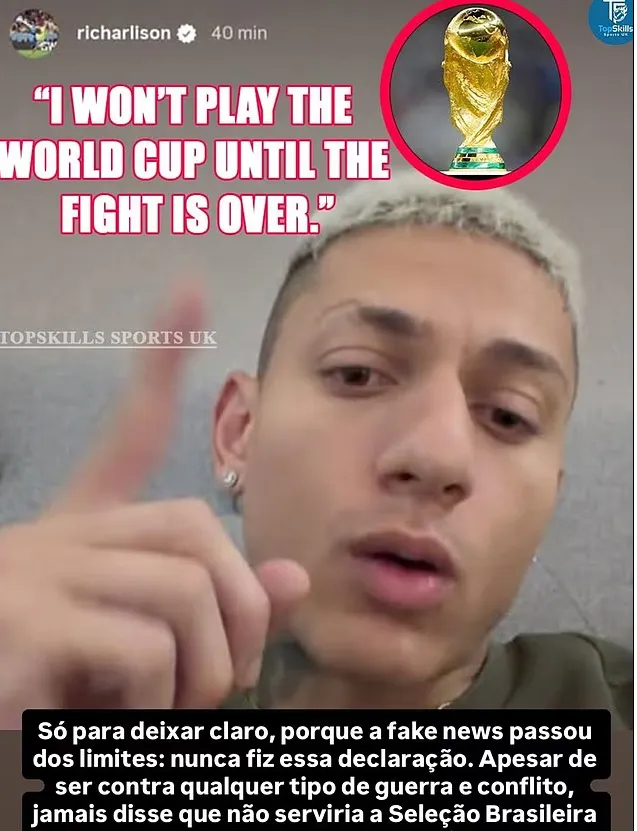 X平台上有一张截图,里查利松的声明是:“如果战争不停止,我就不打世界杯了。”巴西的三场世界杯小组赛都在美国举行。这种声明似乎是为了抗议美国的攻击。