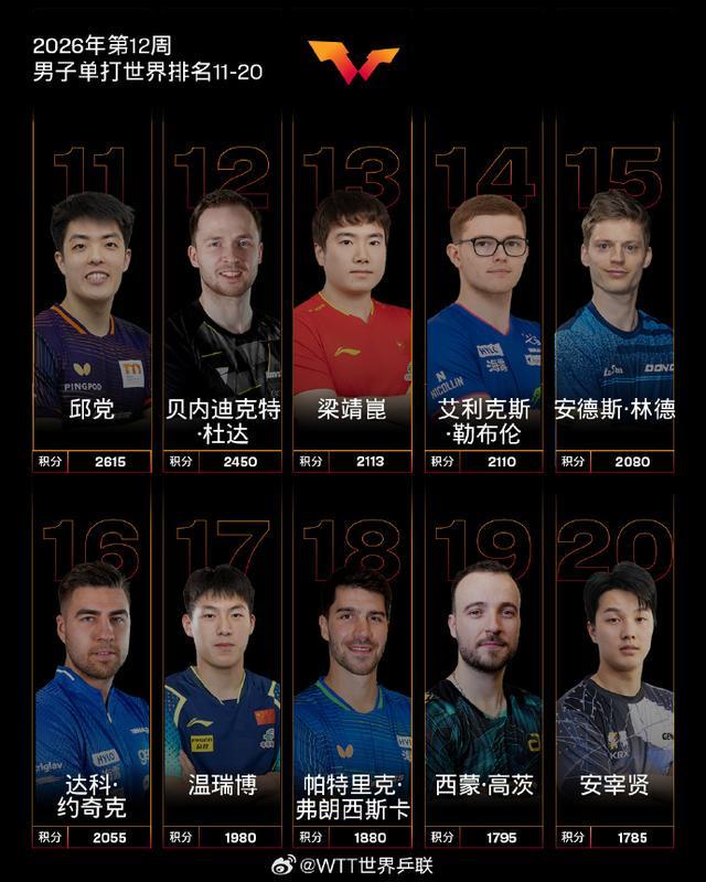 WTT重庆冠军赛男单亚军温瑞博排名上升10位,排名第17位,刷新了个人职业生涯的新高;四强张本智和排名上升了一个,排名第四。;前八名的雨果·卡尔德拉诺排名第三,排名第三。;前八名邱党排名第11位,排名第11位。;十六强林文政排名上升8次,排名第34位。;马蒂亚斯·卡尔森,WTT支线赛奥托塞克站男单冠军,排名第87位,排名第23位。